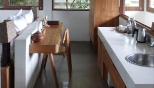テガルサリ「ルーム12」のキチネット。流しと作業スペースがあり、長期滞在中の簡単な準備に重宝しました。