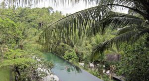 ウブドの中心部から車で20分ほどのジャングルにたたずむのがタンガユダ。唯一宿泊経験のないホテルですが、コマネカ・モンキーフォレストから、シャトルサービスで見学に行きました。