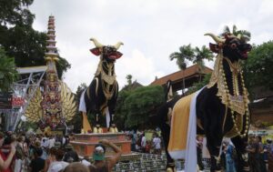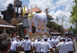 やがて、多くの群衆が集まっているところに現れたのは、白と黒、二頭の神聖な棺ルンブー (Lembu)竹と紙、布で精巧に作られ金色の装飾をまとい、魂を神々のもとへ導く天の馬を象徴です。