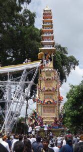 20メートルを超えるほどの巨大なブルボンのバデ(塔)。その堂々たるバデが通るため、邪魔になる電線は一時的に切断されていました。その影響で周囲のショップは停電となり、しばらく営業を止めていたほどです。最初は驚きましたが、それほどまでにこの儀式が地域にとって重要で神聖なものなのだと、深く納得させられました。
