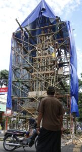 王宮前の通りでは「バデ」の組み立てが始まっていました。大勢の男性たちが集まり、竹や木材を肩に担いで次々と運び込みます。動きには無駄なく、息を合わせて骨組みを組み上げていく姿は、幾度も重ねて来た経験からとわかります。