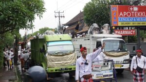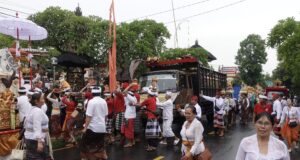 2回目のデンパサール行きでは、途中の村でちょうど祭礼と重なり、バスがしばらく立ち往生するハプニングも。