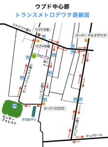 ウブドの街なかでTDMを便利に使いこなす秘訣は、経路とバス停位置を頭に入れておくことです。