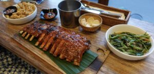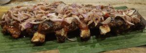 照りのあるタレが光り、バナナリーフの上に盛られたリブは見た目から食欲をそそります。