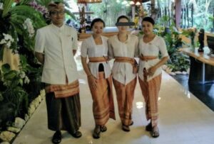 写真のように、ガルンガンなどの行事があるときは、レストランやホテルスタッフが正装をすることがあります。これは、宗教行事の日には、日常の場でも正装が「敬意の表現」として自然に取り入れられているためです。