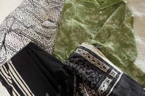 上の2枚は、バリでシャツワンピースに仕立ててもらったもの。下左は夫のサロンに。下右はシルクでショールやサロンに。