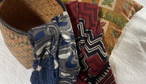 IKATBATIKで選んだ藍の布、Threads of Lifeで出会った文化を守る織物、Kamar Sutraで買った贅沢なシルク、Lucy’s Batikの布で作ったクッションカバー、Oka Kartini Studio 22kで手に取った芸術品のようなバティック、Pithecanthropusで孫に贈ったぬいぐるみ。どれも暮らしの中で息づき、私たち夫婦の思い出を彩っています。