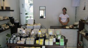 入口の棚には手作りの石鹸が丁寧に並べられていました。