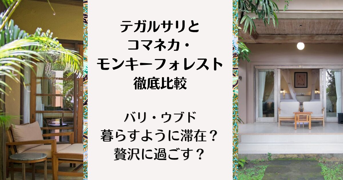 今回ご紹介するのは、これまで滞在してきた「テガルサリ(Tegal Sari Accommodation)」と「コマネカ・アット・モンキーフォレスト」。どちらもとても魅力的ですが「長期滞在して暮らすように過ごしたいか」「短期で安心して贅沢に過ごしたいか」で大きく印象が変わりました。