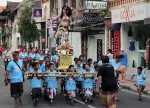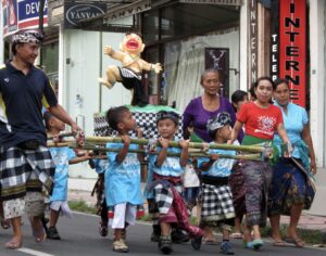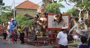 ニュピ(バリ暦の新年)の前夜、各バンジャール(地域コミュニティ)の男性たちが担ぎ手となり、ガムランの演奏とともに大通りを練り歩きます。