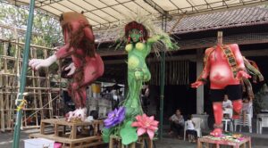 オゴオゴ制作現場の見学は、滞在中だけの“とっておき体験”です。各バンジャールで、竹を組み、鬼の体を紙で覆い、色を重ねていく姿はまるで巨大なアート作品を仕上げていくようでした。